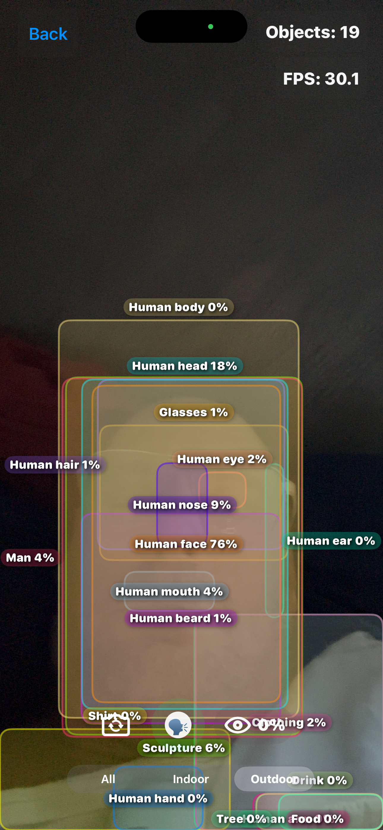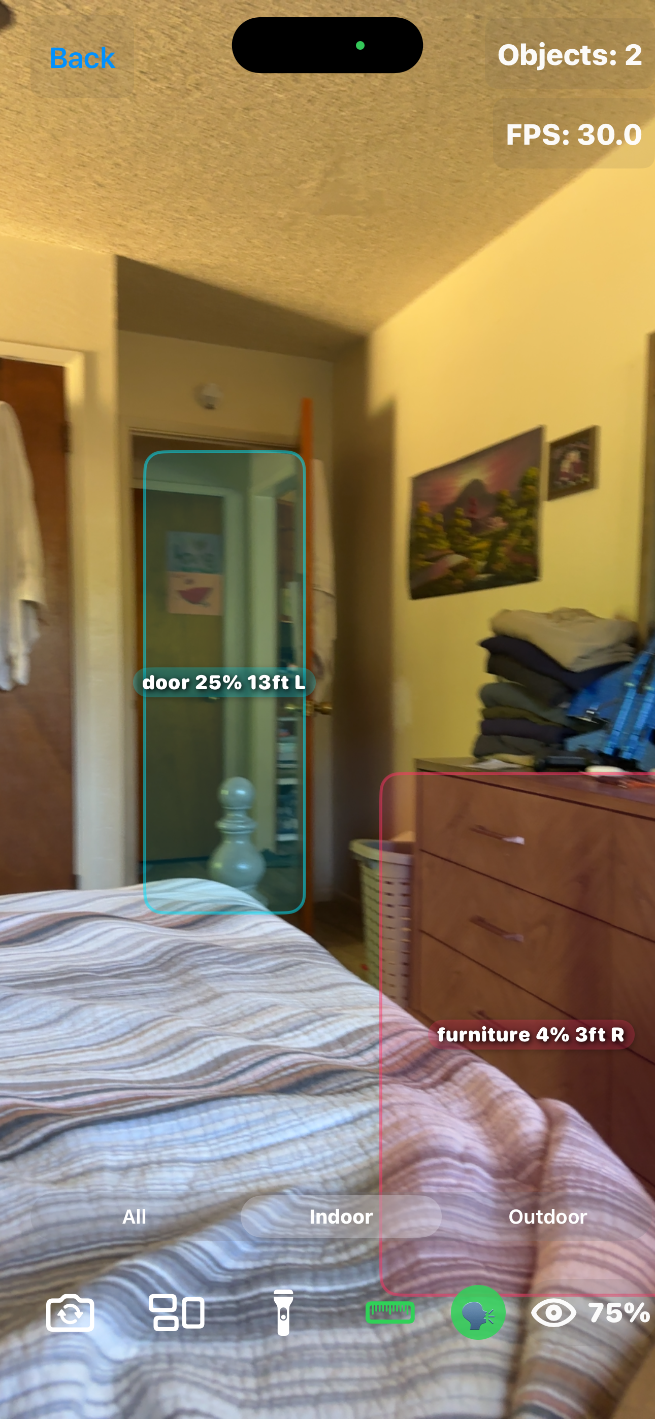 | Offline Spanish→English | 601 object classes | Clean, native UI | Lightweight install | Pro model depth sensing |